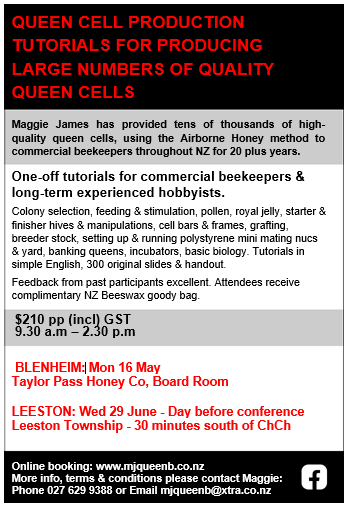 Maggie James has provided tens of thousands of high-quality queen cells, using the Airborne Honey method to commercial beekeepers throughout NZ for 20 plus years.